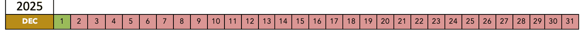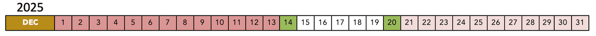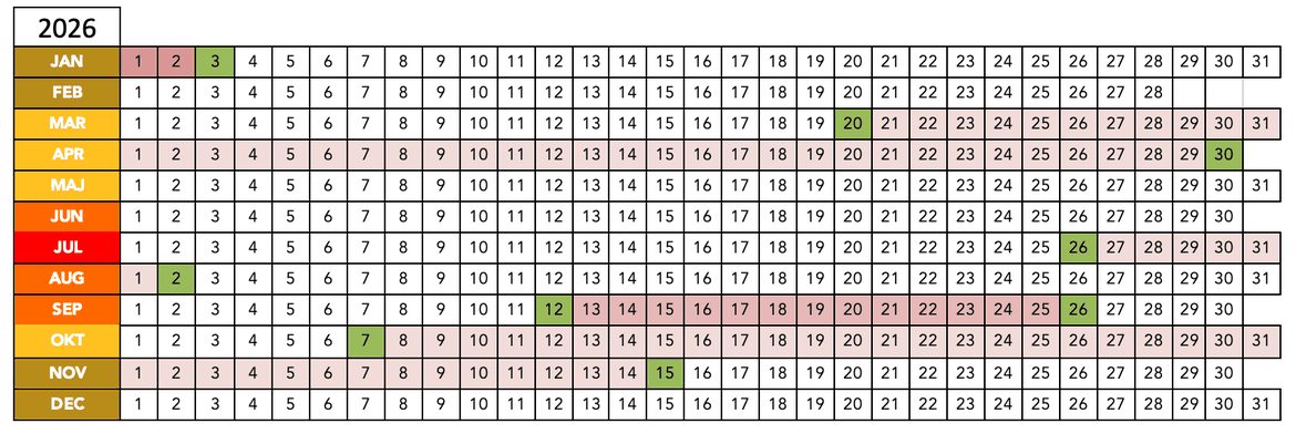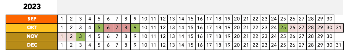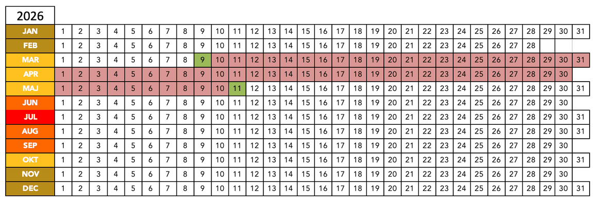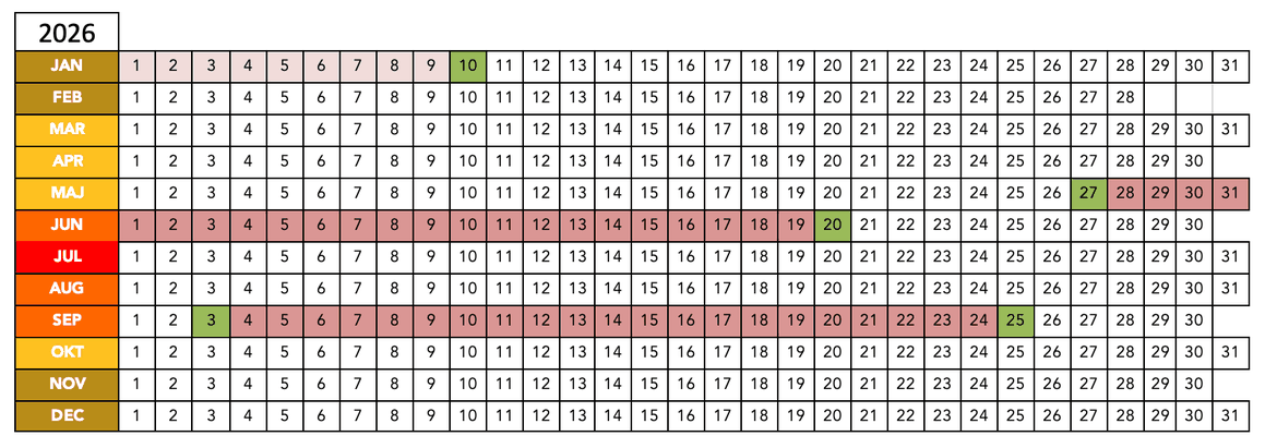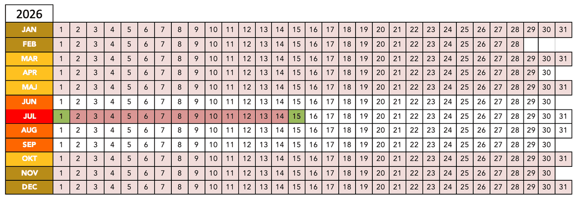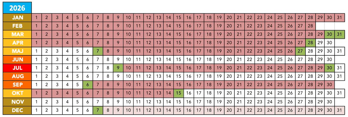 Vit – LedigtGrön – Möjlig ankomst- och avresedag.Blå – ReserveradAnnan färg – Bokat