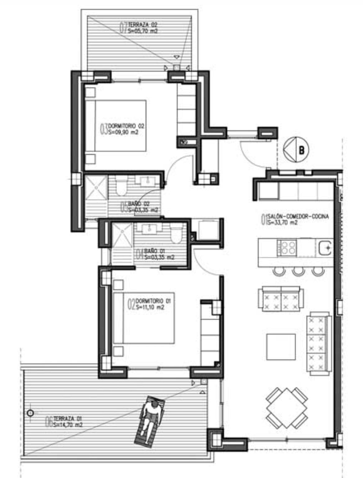 Lägenheten erbjuder två rymliga sovrum och två stilrena badrum. Den öppna planlösningen mellan kök och vardagsrum skapar en luftig och social atmosfär, där köket och vardagsrummet binds samman av en praktisk frukostbar. Från vardagsrummet når du den generösa balkongen med utmärkt solläge – perfekt för avkoppling och måltider utomhus.