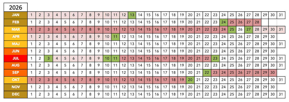 Grön – Möjlig ankomst- och avresedag.